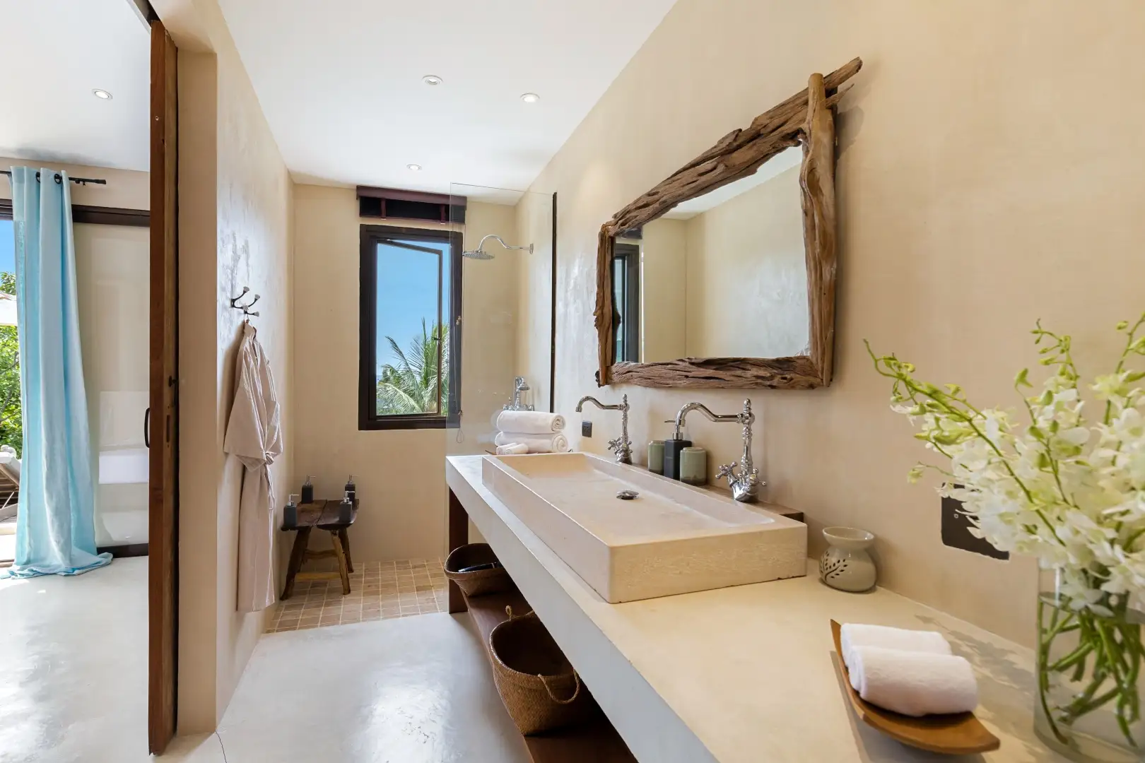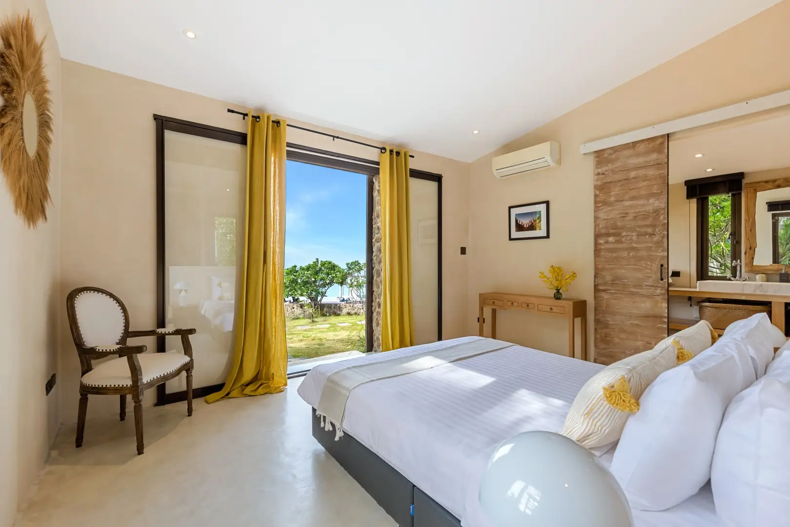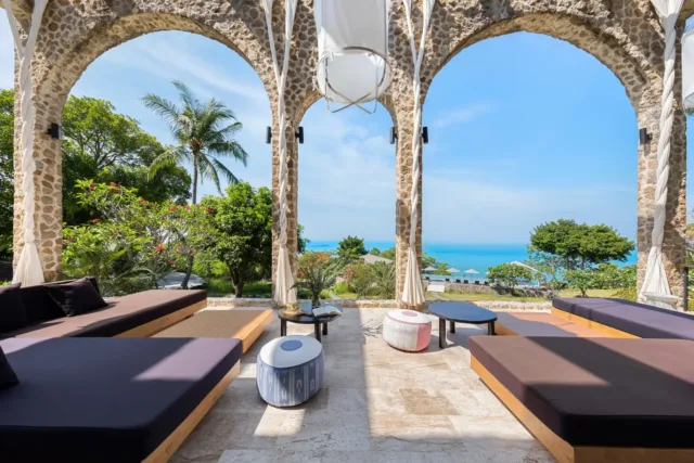 Stone textures, plaster finishes, and wide terraces contribute to a Mediterranean style adapted to the tropical environment of Koh Samui. High ceilings in the main living areas allow natural light to enter throughout the day while maintaining ventilation and comfort.