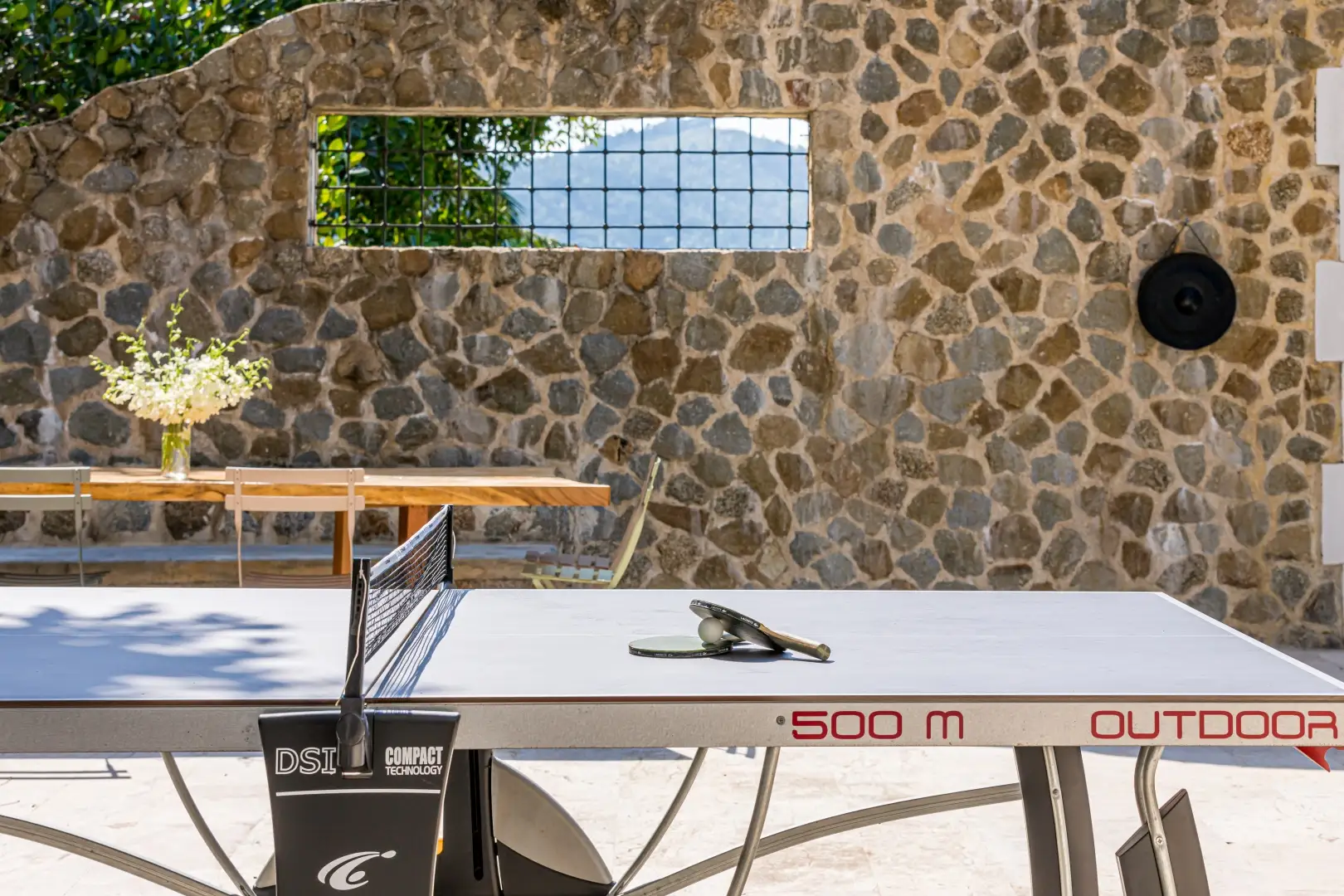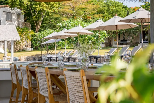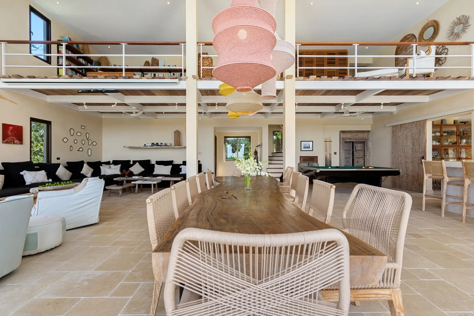A long dining table allows meals to be shared by up to twenty-two people, making the villa suitable for large family holidays, corporate retreats, or private celebrations.