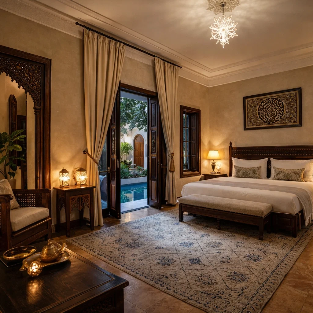 Interior spaces incorporate decorative elements inspired by Moroccan art and Moorish architecture. Each room features a unique identity, with attention given to materials, textures, and spatial comfort.