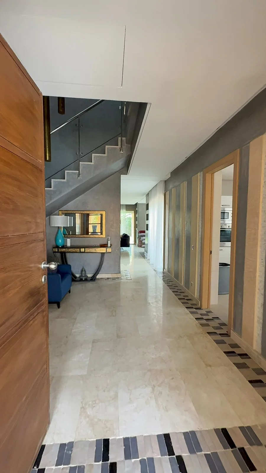 The villa opens onto an entrance hall that leads into a spacious and well-organized interior layout. The main living room benefits from natural light through large openings, creating a bright and comfortable space, complemented by a fireplace that adds both functionality and a warm atmosphere.